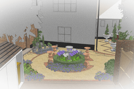 The brief was to bring back some classic charm to the garden, while incorporating some modern flourishes, such as Fermob furniture. The clients were very keen for a central parterre style feature, and room for their extensive collection of classic pots and urns that they will be relocating from a much larger garden. Additionally, they wanted three seating areas at different points in the garden. At around 60m2, and without a single right angle, this was quite the challenge! After playing with various geometry, it was evident that the best solution for the main area was a radial design, as this was the only way to avoid sharp angles encroaching on pathways, and to enable flow around the space. A side patio area incorporates a diagonal pattern to detract the eye from the uneven angles of the house and opposite wall. A simple planting scheme will create cohesion in this small space and ensure that the central feature and topiary planters can be fully appreciated.